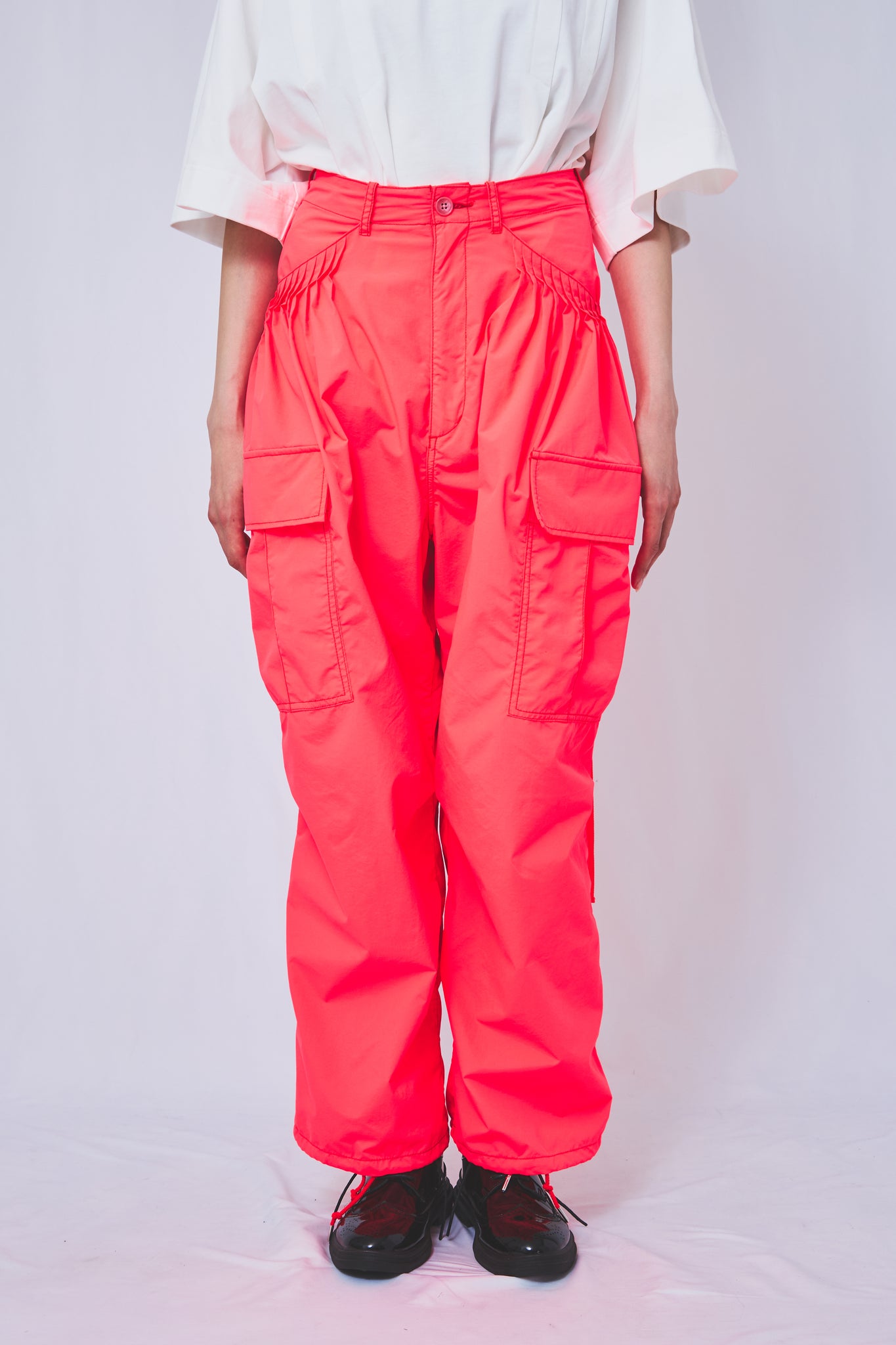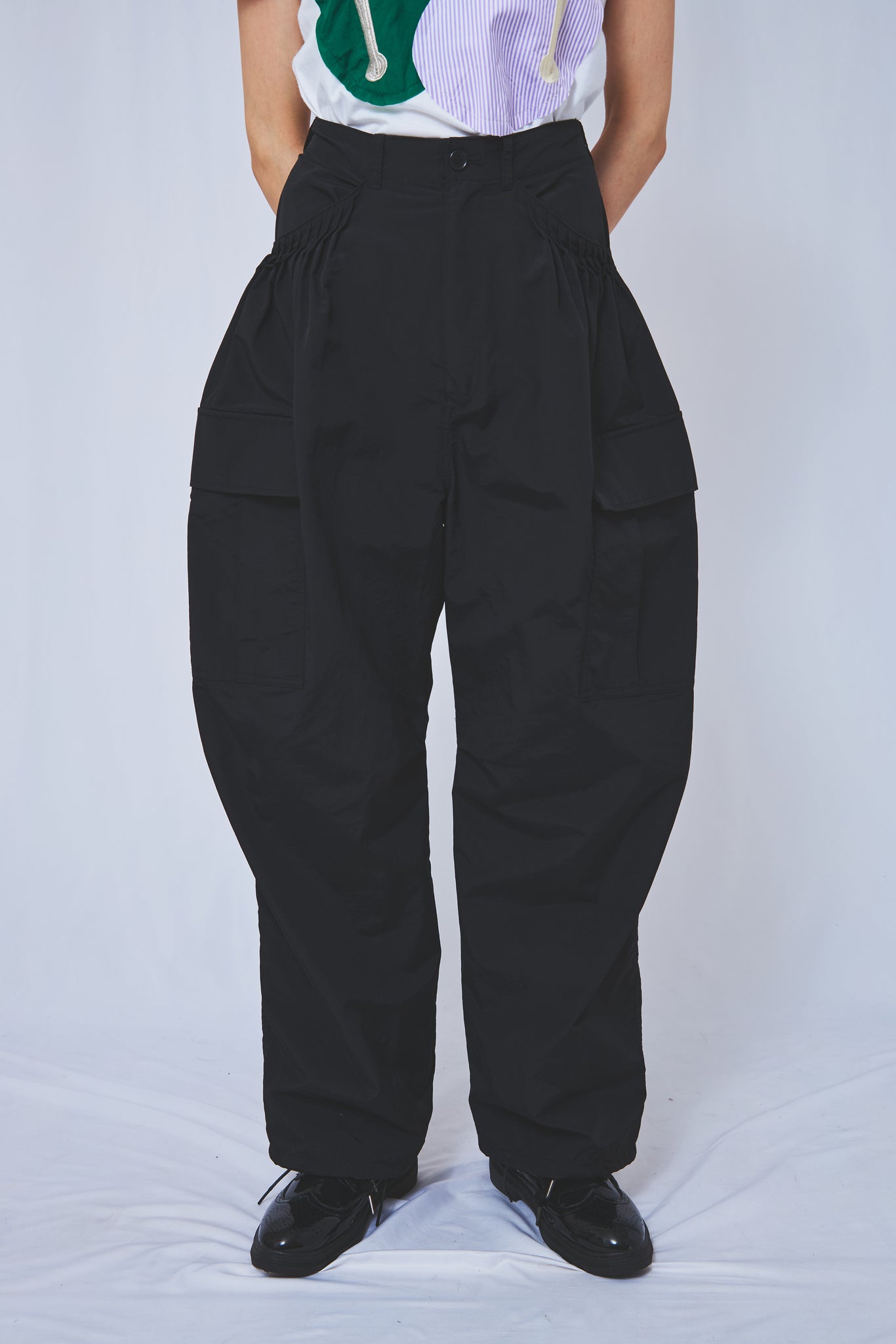 きめの細かいナイロンのクロ゙グラン素材。撥水加工を施しているため、春の寒い風雨をふせき、゙汚れ避けにもなります。 細かいピンタックが美しいカーゴパンツ。後ウエストゴム仕様。裾スピンドルで裾絞り可能。