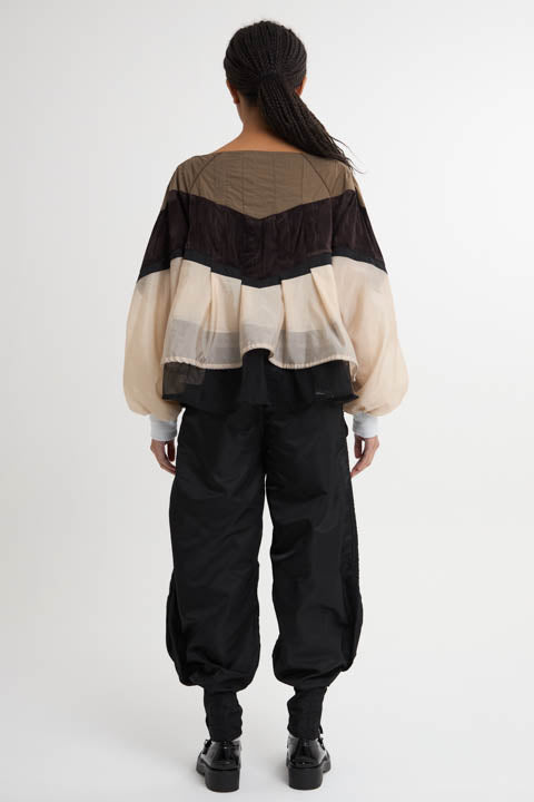 This Boat Neck Layered Windbreaker is crafted from 100% recycled nylon taffeta, contrasted with panels of tulle velvet, tulle lace, and chambray fabric. Despite its complex construction, the piece remains exceptionally lightweight.