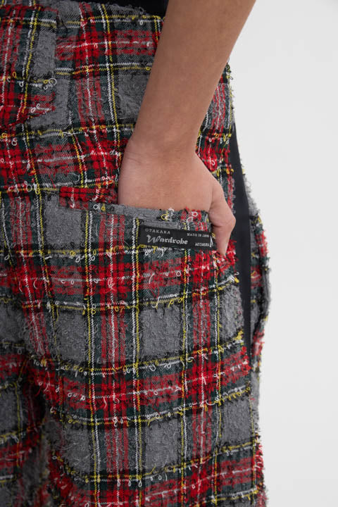 Made from yarn-dyed tartan check fabric, the surface is treated with a needle-punch technique that pulls out fibers to create a textured, tweed-like effect. The pants feature a zippered hem that can be worn open for a relaxed look or closed for a tapered finish.