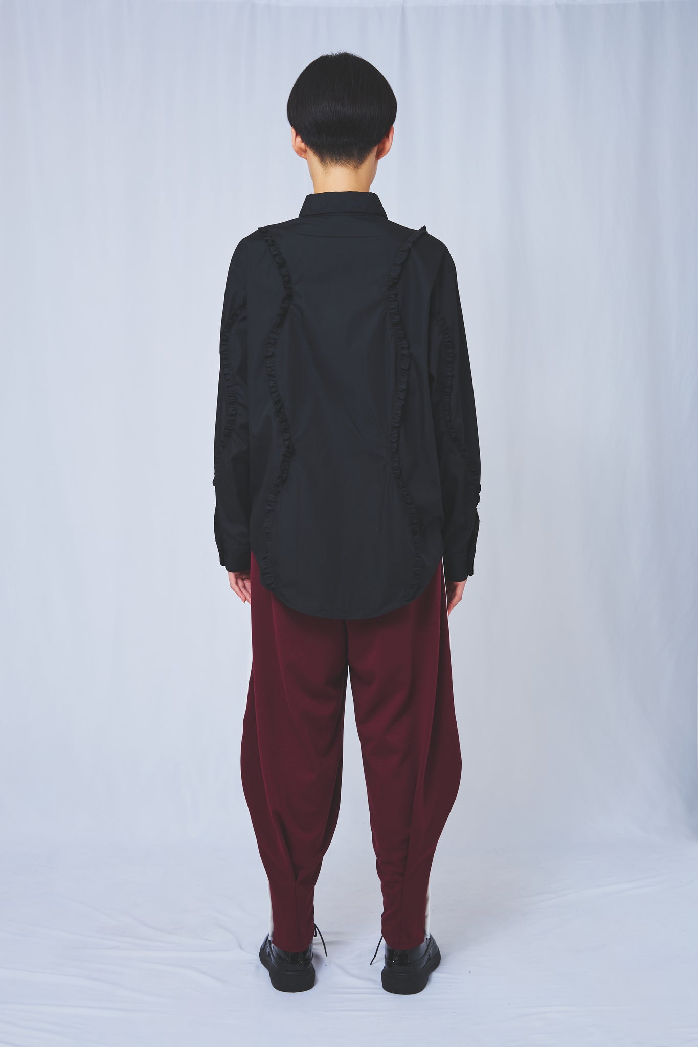 イージーケアのリサイクル糸を用いたシャツ素材に、今季のテーマを反映したカーブ状のちびフリルをあしらった一枚。ユニセックスで楽しめるデザインです。