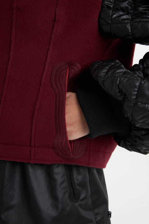 ボディは日本の一大ウール産地である、尾州産地で作られた、ウールモッサーに防風フィルムが入った裏地兼用のトリコット芯をボンディングしたMEGMIURAを代表する素材を用いています。袖は極薄の合皮を伸縮のある糸でキルティングに仕上げています。襟はZipを閉じることでフードになります。シグネチャー刺繍ボタンホールとポケットがポイント。
